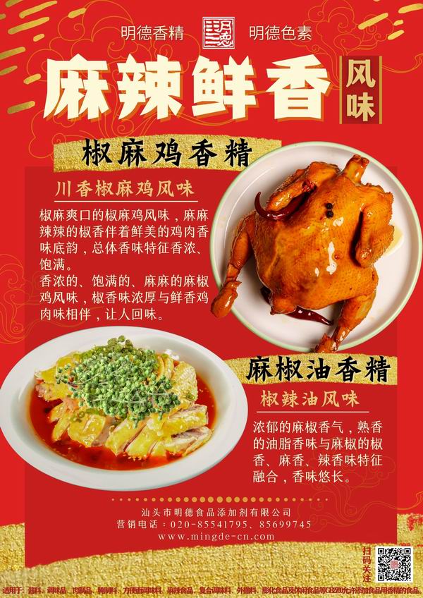更有椒麻雞香精、麻椒油香精等椒辣味風(fēng)味香精,運(yùn)用于肉制品、調(diào)味料、外撒粉等產(chǎn)品中,為產(chǎn)品帶來(lái)麻辣鮮香的風(fēng)味體驗(yàn)。